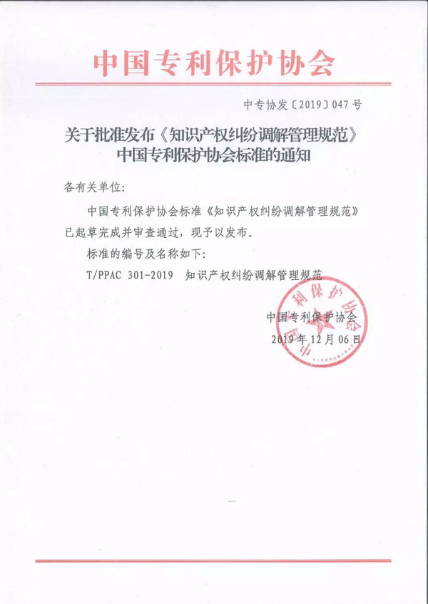 關(guān)于批準(zhǔn)發(fā)布《知識產(chǎn)權(quán)糾紛調(diào)解管理規(guī)范》中國專利保護(hù)協(xié)會標(biāo)準(zhǔn)的通知