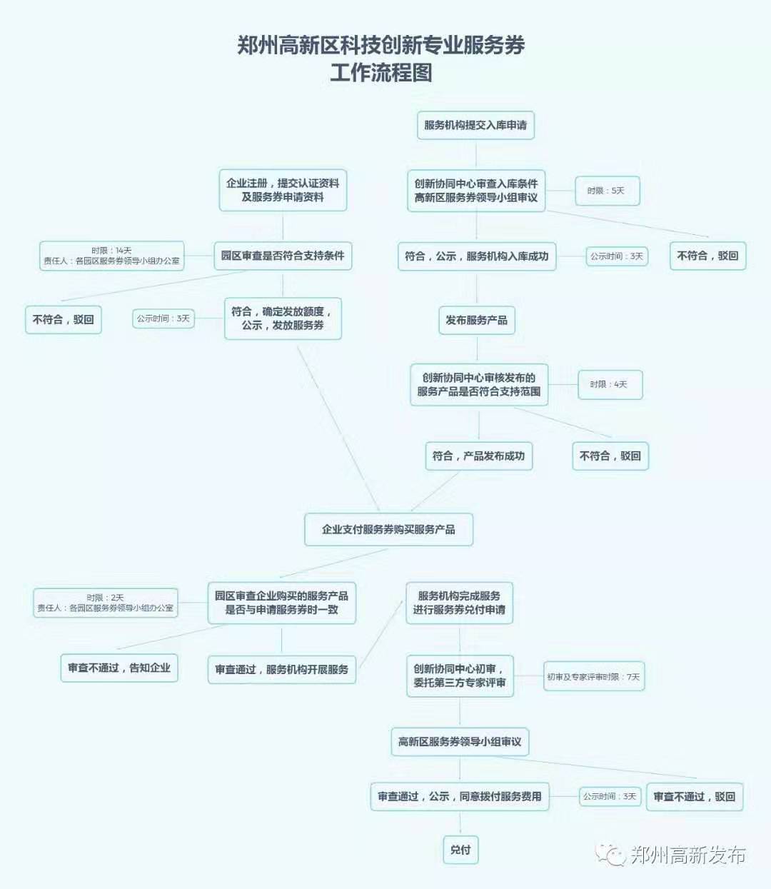 為做好這項(xiàng)工作,高新區(qū)創(chuàng)新發(fā)展局牽頭各相關(guān)單位,先后召開專題研究會議30余次,出臺了《鄭州高新技術(shù)產(chǎn)業(yè)開發(fā)區(qū)科技創(chuàng)新專業(yè)服務(wù)券管理暫行辦法(試行)》和3個實(shí)施細(xì)則(《鄭州高新技術(shù)產(chǎn)業(yè)開發(fā)區(qū)科技創(chuàng)新專業(yè)服務(wù)券受理審核發(fā)放實(shí)施細(xì)則(試行)》、《鄭州高新技術(shù)產(chǎn)業(yè)開發(fā)區(qū)科技創(chuàng)新專業(yè)服務(wù)券服務(wù)機(jī)構(gòu)入庫管理細(xì)則(試行)》、《鄭州高新技術(shù)產(chǎn)業(yè)開發(fā)區(qū)科技創(chuàng)新專業(yè)服務(wù)券兌付實(shí)施細(xì)則(試行)》),制定了從申請、發(fā)放、使用到兌付的較為科學(xué)、可操作性強(qiáng)的工作流程圖。